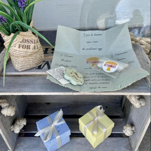 La proposta comprende una partecipazione su carta naturale personalizzata con logo “Attivamente” e frase dedicata, accompagnata da una bomba di semi confezionata con sacchettino e confetti coordinati. Un’idea semplice ma ricca di significato, che invita a piantare oggi per far fiorire domani.