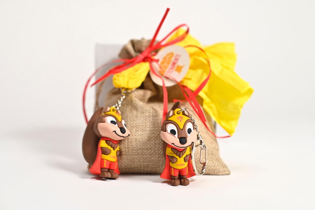 La confezione comprende un sacchettino in juta naturale decorato con carta velina gialla, fiocco rosso, tag coordinato e confetti. Per ogni bomboniera è incluso all'interno un portachiavi della mascotte di AttivaMente, GIGA, colorato e curato nei dettagli, simbolo di energia, coraggio e impegno.